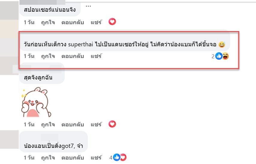 “วันก่อนเห็นเด็กวง superthai ไปเป็นแดนเซอร์ให้อยู่ ไม่คิดว่าน้องแบมก็ได้ขึ้นจอ”