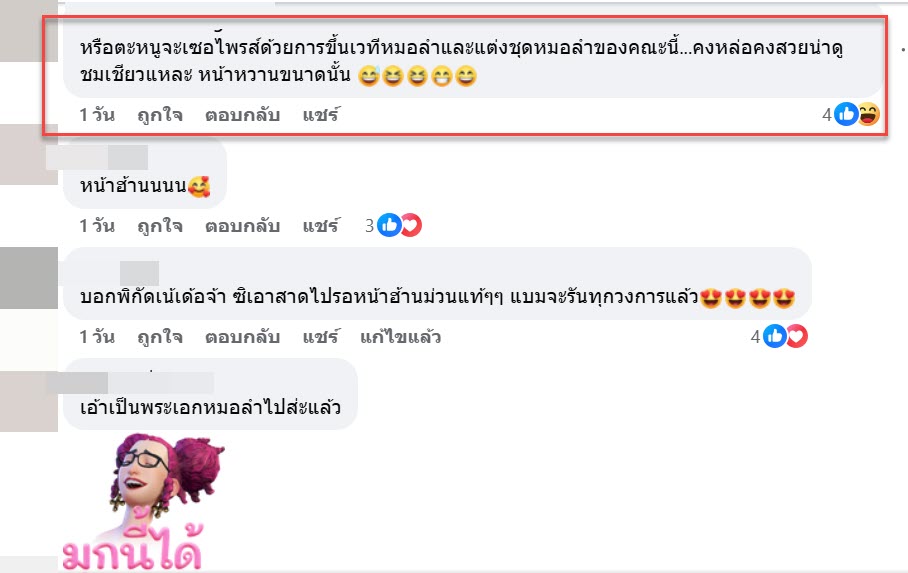 “หรือตะหนูจะเซอไพรส์ด้วยการขึ้นเวทีหมอลำและแต่งชุดหมอลำของคณะนี้…คงหล่อคงสวยน่าดูชมเชียวแหละ หน้าหวานขนาดนั้น”