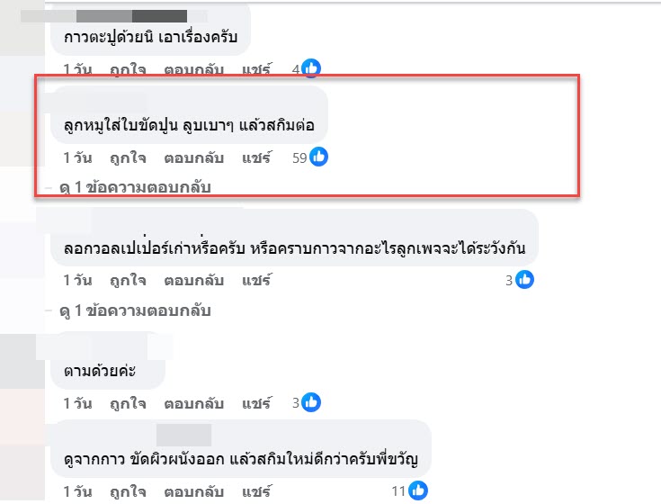จากคลิปนี้ก็มีหลายคนเข้ามาแสดงความคิดเห็นกันอย่างมากมายทั้งบอกว่า”ลูกหมูใส่ใบขัดปูน ลูบเบาๆ แล้วสกิมต่อ”
