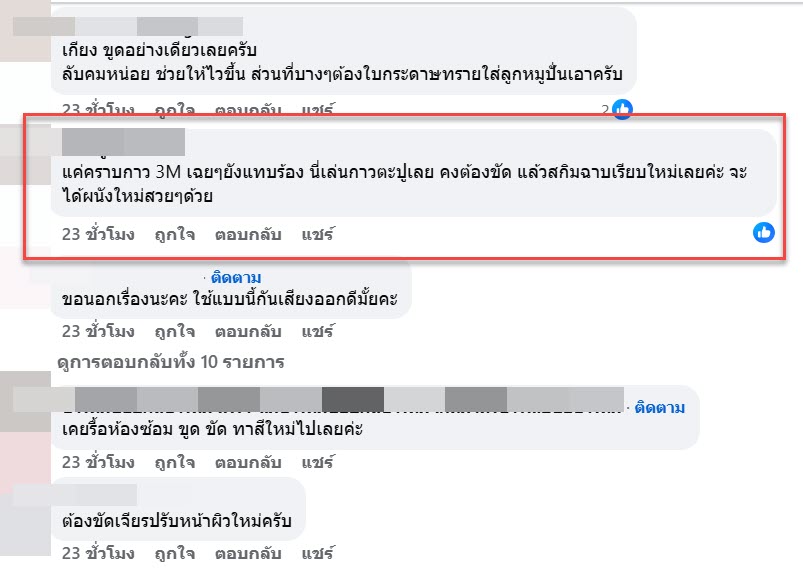 โดยจากในโพสต์นี้ก็มีหลายคนเข้ามาให้คำแนะนำ ทั้งบอกให้ขัด แล้วฉาบสกิมใหม่ หรือบางคนบอกว่าให้ใช้สเปรย์สำหรับกำจัดคราบกาว เพื่อจะได้หลุดออกง่ายมากขึ้น