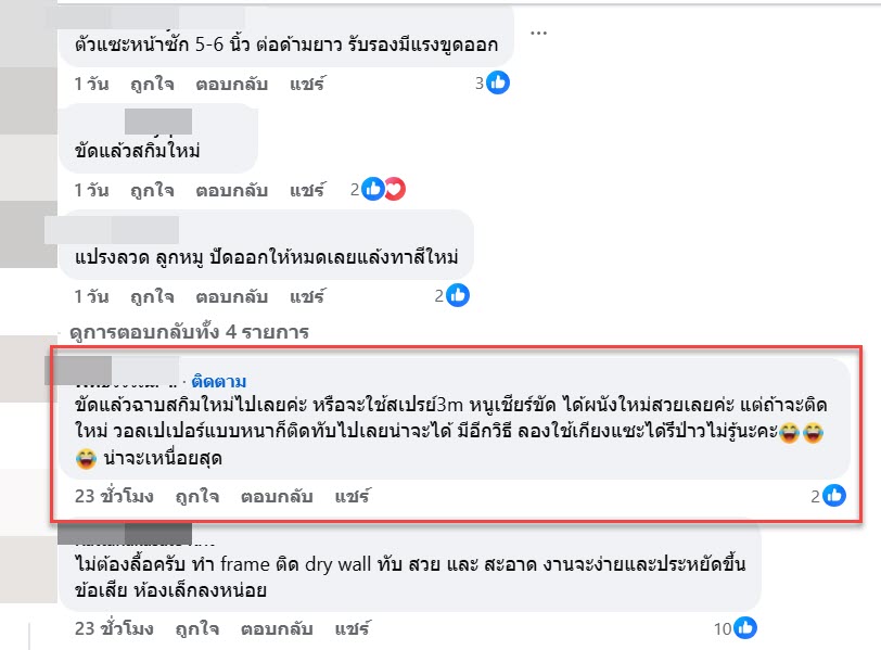 โดยจากในโพสต์นี้ก็มีหลายคนเข้ามาให้คำแนะนำ ทั้งบอกให้ขัด แล้วฉาบสกิมใหม่ หรือบางคนบอกว่าให้ใช้สเปรย์สำหรับกำจัดคราบกาว เพื่อจะได้หลุดออกง่ายมากขึ้น