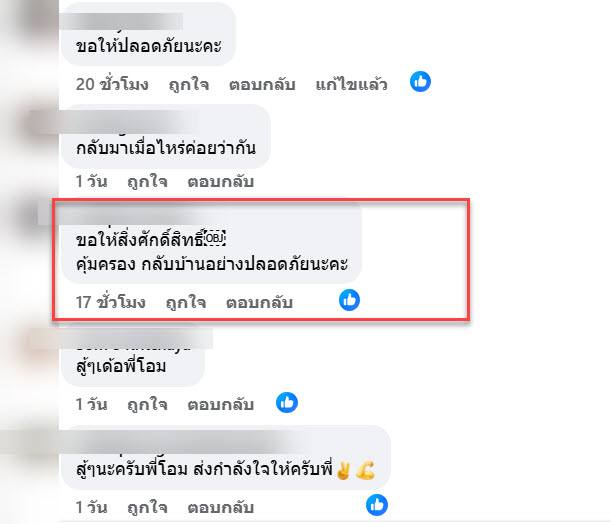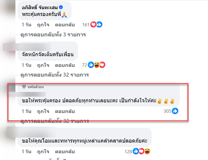 จากโพสต์นี้ก็ได้มีหลายคนเข้ามาแสดงความคิดเห็นกันอย่างมากมาย ทั้งบอกว่า “ขอให้พระคุ้มครอง ปลอดภัยทุกท่านเลยนะคะ เป็นกำลังใจให้ค่ะ”
