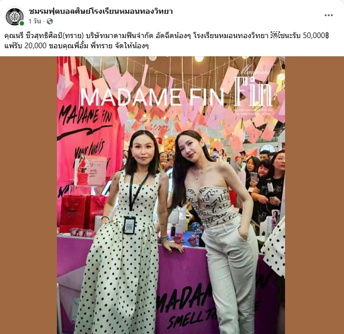 โดยเมื่อวานนี้ (6 พ.ย. 68) เพจเฟซบุ๊ก ชมรมฟุตบอลศิษย์โรงเรียนหมอนทองวิทยา ได้โพสต์ขอบคุณซุปตาร์ชื่อดัง อั้ม พัชราภา และ ทราย นรี หรือ ทราย มาดามฟิน หลังอัดฉีดเงินจำนวน 50,000 บาท หากทางทีมโรงเรียนหมอนทองวิทยาชนะการแข่งขัน หรือหากแพ้ก็จะได้รับเงินจำนวน 20,000 บาทแทน