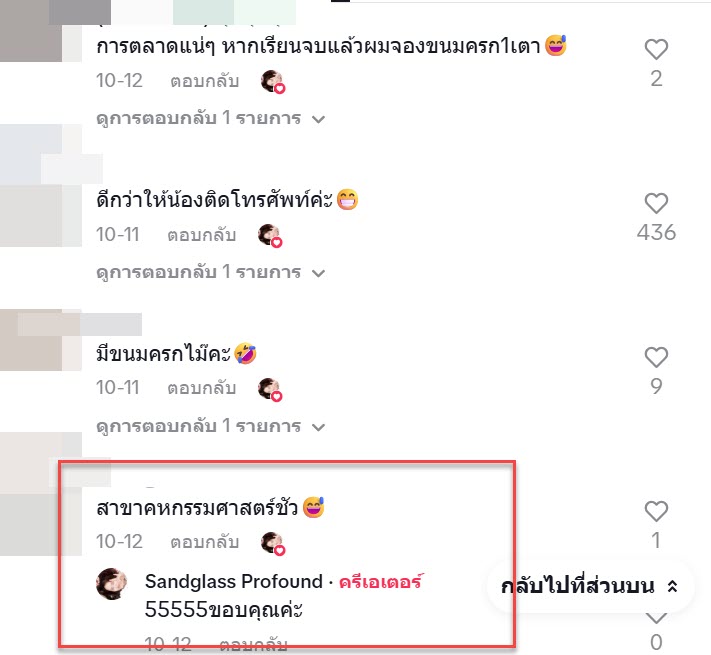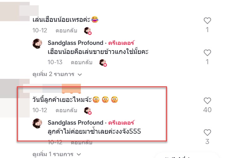 จากคลิปนี้มีหลายคนเข้ามาแสดงความคิดเห็นกันอย่างมากมาย ท้งบอกว่า “วันนี้ลูกค้าเยอะไหมจ้ะ” “ลูกค้าไม่ค่อยมาซ้ำเลยค่ะงงจัง555”