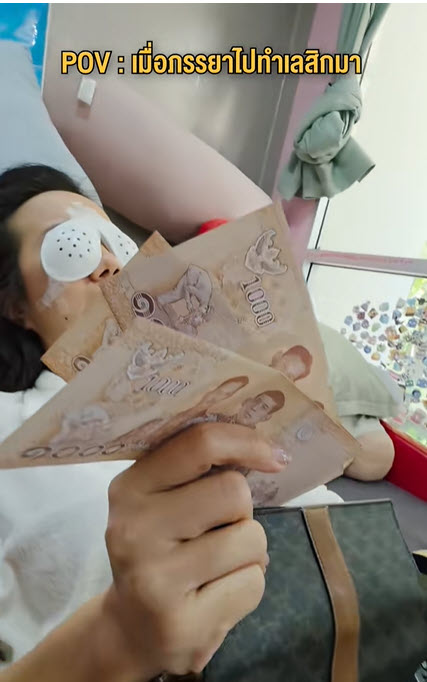 จากนั้นก็หยิบเงินในกระเป๋าออกมาโดยปกติภรรยาให้เงินไปทำงานวันละ 400 บาท ซึ่งพอควักเงินออกจากกระเป๋าซึ่งเป็นแบงก์พัน แต่ด้วยความมองไม่เห็นเลยถามสามีว่าแบงก์อะไร สามีเลยบอกว่า แบงก์ 100 งานนี้เลยได้ไป 4,000