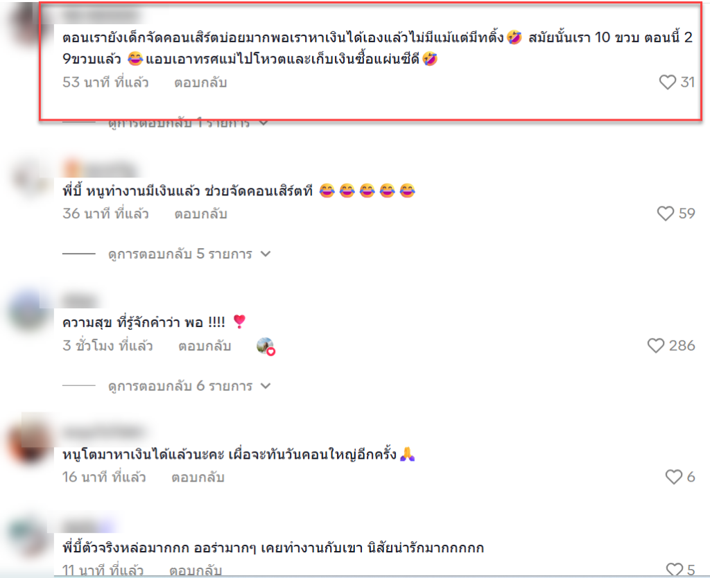 จากคลิปนี้หลายคนเข้ามาแสดงความคิดเห็นกันอย่างมากมาย”ตอนเรายังเด็กจัดคอนเสิร์ตบ่อยมากพอเราหาเงินได้เองแล้วไม่มีแม้แต่มีทติ้ง สมัยนั้นเรา 10 ขวบ ตอนนี้ 29ขวบแล้ว แอบเอาทรศแม่ไปโหวตและเก็บเงินซื้อแผ่นซีดี”