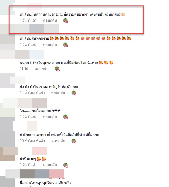 “คนไทยมีหลากหลายอารมณ์ มีความสุขมากๆนะค่ะสุขสันต์วันเกิดค่ะ”