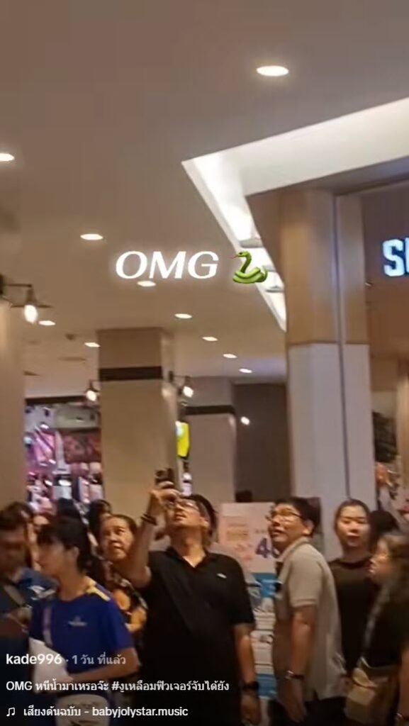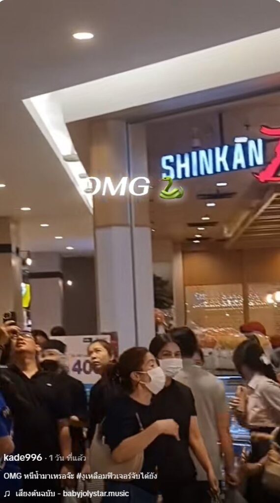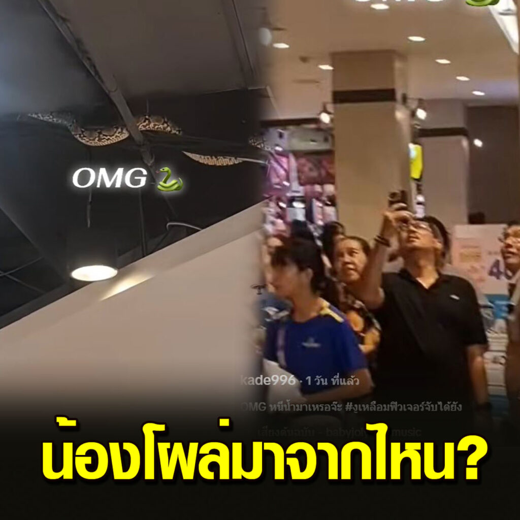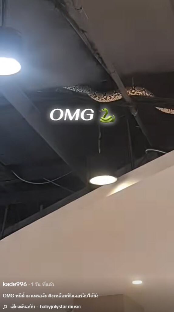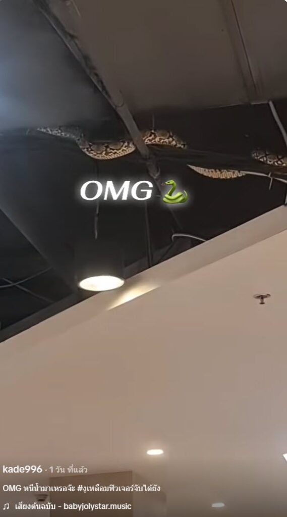 เป็นอีกหนึ่งคลิปที่ทำเอาหลายคนแตกตื่นกันอย่างมาก หลังจากที่บัญชีผู้ใช้ TikTok ที่ใช้ชื่อ @kade996 ได้ออกมาโพสต์คลิป หลังมีงูเหลือมตัวใหญ่โผล่เลื้อยอยู่ที่ฝ้าเพดานของห้าง ทำเอาลูกค้าตกใจเป็นอย่างมาก โดยจากโพสต์นั้นได้ระบุว่า “OMG หนีน้ำมาเหรอจ๊ะ “