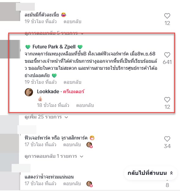 จากคลิปนี้ก็มีหลายคนเข้ามาแสดงความคิดเห็นกันอย่างมาก”จากเหตุการ์ณพบงูเหลือมที่ชั้นB ฝั่งเวสต์ฟิวเจอร์พาร์ค เมื่อ8พ.ย.68 ขณะนี้ทางเจ้าหน้าที่ได้ดำเนินการนำงูออกจากพื้นที่เป็นที่เรียบร้อยแล้ว ขออภัยในความไม่สะดวก และท่านสามารถใช้บริการศูนย์การค้าได้อย่างปลอดภัย “