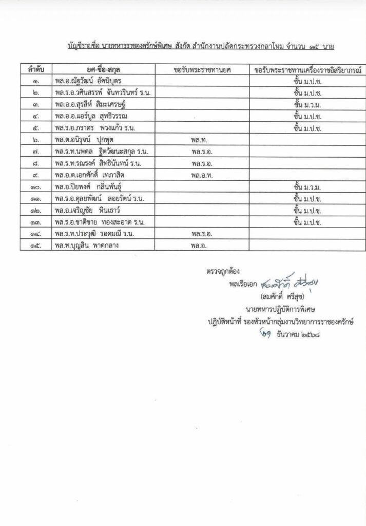 สาระสำคัญระบุว่า ด้วยมีพระบรมราชโองการโปรดเกล้าโปรดกระหม่อม พระราชทานยศทหาร และพระราชทานเครื่องราชอิสริยาภรณ์ เป็นกรณีพิเศษ ให้นายทหารราชองครักษ์พิเศษ จำนวน 15 นาย การนี้ เพื่อให้การปฎิบัติเป็นไปด้วยความเรียบร้อย สำนักงานราชองครักษ์ประจำพระองค์ จึงขอแจ้งกำหนดพิธีเข้ารับพระราชทานประดับเครื่องหมายยศ และพิธีเข้ารับพระราชทานเครื่องราชอิสริยาภรณ์เบื้องหน้าพระบรมฉายาลักษณ์ ในวันอาทิตย์ที่ 28 ธันวาคม 2568 เวลา 09.00 น. ณ อาคาร 606 สนามเสือป่า พระราชวังดุสิต