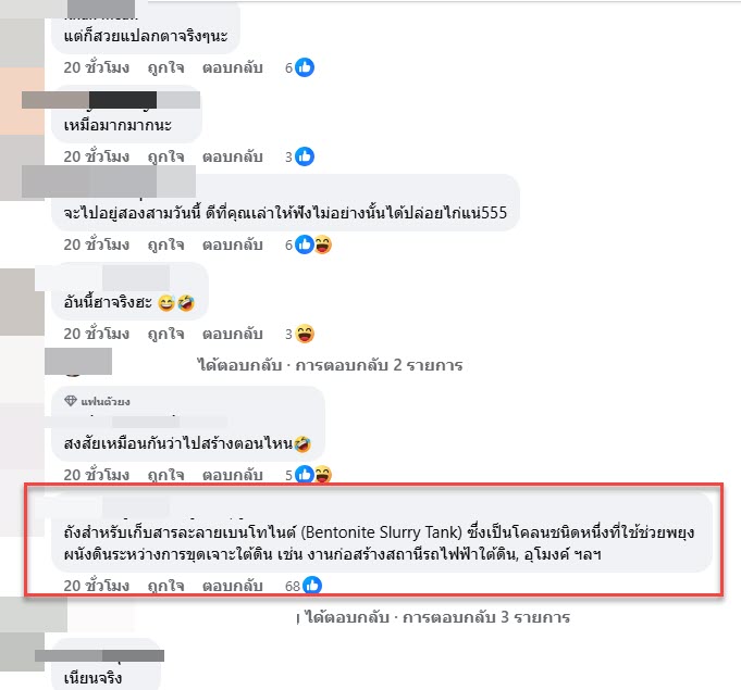 ซึ่งจากในภาพนี้ก็มีหลายคนเข้ามาแสดงความคิดเห็นกันอย่างมากมาย “ถังสำหรับเก็บสารละลายเบนโทไนต์ (Bentonite Slurry Tank) ซึ่งเป็นโคลนชนิดหนึ่งที่ใช้ช่วยพยุงผนังดินระหว่างการขุดเจาะใต้ดิน เช่น งานก่อสร้างสถานีรถไฟฟ้าใต้ดิน, อุโมงค์ ฯลฯ”