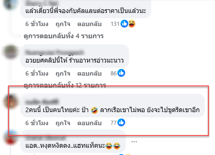 โดยจากประเด็นนี้ก็มีหลายคนเข้ามาแสดงความคิดเห็นกันอย่างมากมายทั้งบอกว่า “2คนนี้ เป็นคนไทยค่ะ ป้า ลากเรือเขาไม่พอ ยังจะไปขูดรีดเขาอีก”