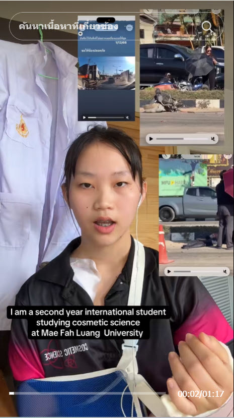 อุบัติเหตุดังกล่าวเกิดขึ้นเมื่อวันที่ 1 ธันวาคม ที่ผ่านมา โดยรถกระบะขับฝ่าไฟแดง บริเวณแยกไฟแดงมหาวิทยาลัยแม่ฟ้าหลวง จ.เชียงราย พุ่งชนใส่คนขี่รถจักรยานยนต์ และกระเด็นมาชนหญิงเจ้าของคลิป จนบาดเจ็บบริเวณหลังและสะโพก แขนซ้ายและข้อมือขวาผิดรูป ก่อนที่กู้ภัยจะพาส่งโรงพยาบาล ส่วนคนขี่จักรยานยนต์นั้นเจ็บสาหัส ก่อนจะเสีXชีวิตในเวลาต่อมา