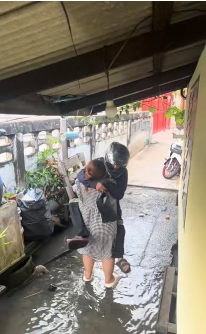 เมื่อน้ำท่วมบ้านแล้วผู้ชายมาหา เลยไม่อยากให้ผู้ชายเดินลุยน้ำก็เลยเดินลงมารับ และสิ่งที่ผู้ชายทำคือกระโดดขึ้นให้อุ้มเพื่อจะได้ไม่ต้องลุยน้ำ