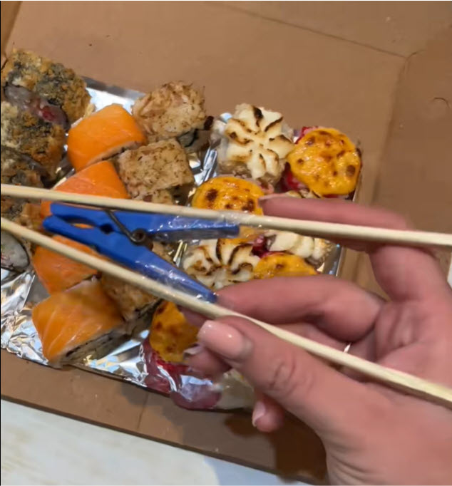โดยจากในคลิปนั้นได้เผยให้เห็นว่าเจ้าของคลิปได้ดัดแปลงตะเกียบโดยการใส่ไม้หนีบผ้าและติดเทปกาวใส่ลงไป ทำให้หนีบและคีบได้ง่ายขึ้น