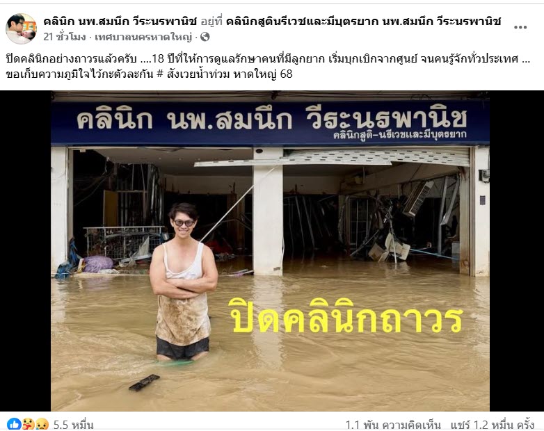 จากเหตุการณ์น้ำท่วมหนักในหาดใหญ่ จนเกิดเป็นมหาอุทกภัยหนักมีประชาชนได้รับความเดือดร้อนมากมาย อย่างล่าสุดทางเพจ คลินิก นพ.สมนึก วีระนรพานิช ซึ่งเป็นคุณหมอที่เปิดคลีนิกที่หาดใหญ่ได้ออกมาโพสต์ข้อความระบุว่า