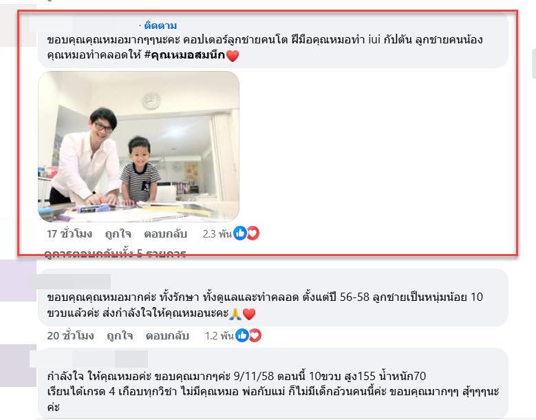 โดยจากในโพสต์นี้ก็มีคนเข้ามาให้กำลังใจ และคนที่เคยเป็นคนไข้ของคุณหมอก็เข้ามาโพสต์รูปลูกๆที่คุณหมอเคยทำคลอดให้ หรือคุณหมอเคยดูแล เป็นภาพที่อบอุ่นมากๆ