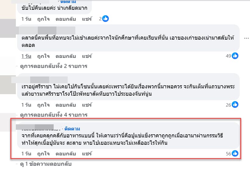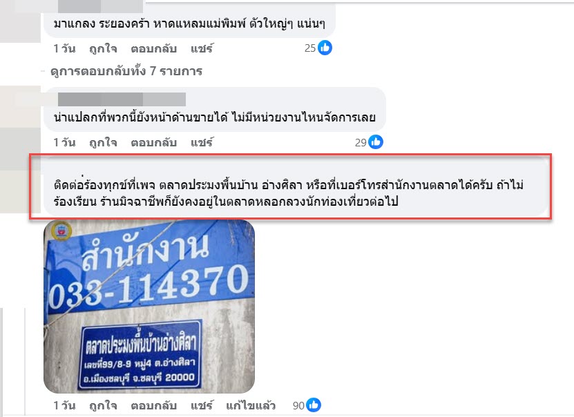 “ติดต่อร้องทุกข์ที่เพจ ตลาดประมงพื้นบ้าน อ่างศิลา หรือที่เบอร์โทรสำนักงานตลาดได้ครับ ถ้าไม่ร้องเรียน ร้านมิจฉาชีพก็ยังคงอยู่ในตลาดหลอกลวงนักท่องเที่ยวต่อไป”