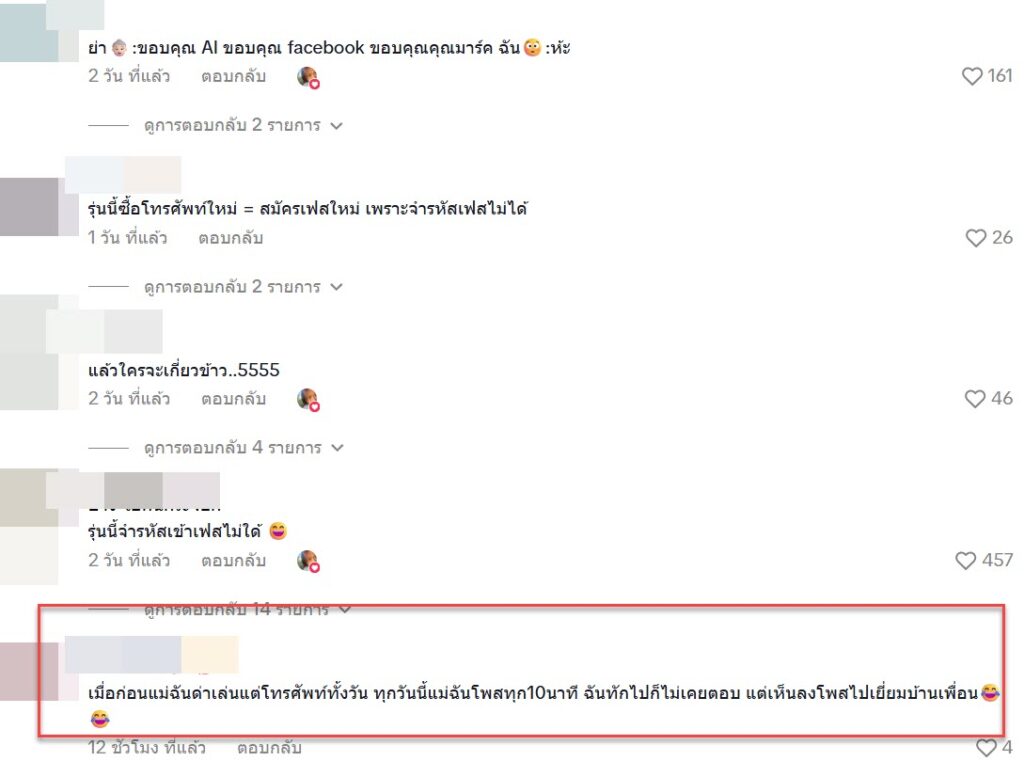 “เมื่อก่อนแม่ฉันด่าเล่นแต่โทรศัพท์ทั้งวัน ทุกวันนี้แม่ฉันโพสทุก10นาที ฉันทักไปก็ไม่เคยตอบ แต่เห็นลงโพสไปเยี่ยมบ้านเพื่อน”