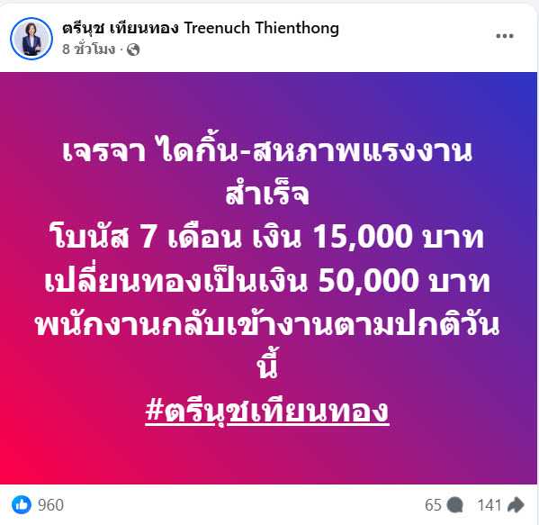 นางสาวตรีนุช เทียนทอง รัฐมนตรีว่าการกระทรวงแรงงาน เปิดเผยถึงความคืบหน้าการเจรจาระหว่างบริษัท ไดกิ้น อินดัสทรีส์ (ประเทศไทย) จำกัด กับ สหภาพแรงงานไดกิ้น อมตะ รักษ์เสรี ว่าหลังจากใช้เวลาเจรจาร่วมกันยาวนานกว่า 12 ชั่วโมง ตั้งแต่วันจันทร์ที่ 8 ธันวาคม 2568 เวลา 13.00 น. จนถึงเวลา 00.30 น. ของวันอังคารที่ 9 ธันวาคม 2568 ในที่สุดก็ได้ข้อยุติเป็นที่น่าพอใจของทั้งสองฝ่าย