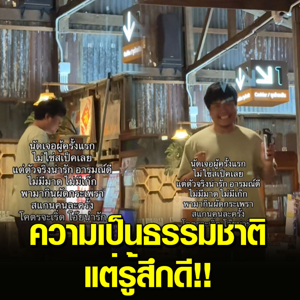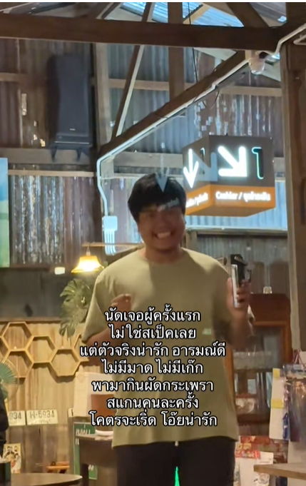 “นัดเจอผู้ครั้งแรก ไม่ใช่สเปคเลย แต่ตัวจริงน่ารัก อารมณ์ดีไม่มีมาด ไม่มีเก๊ก พามากินผัดกะเพรา สแกนคนละครึ่ง โคตรจะเริ่ด โอ๊ยน่ารัก”