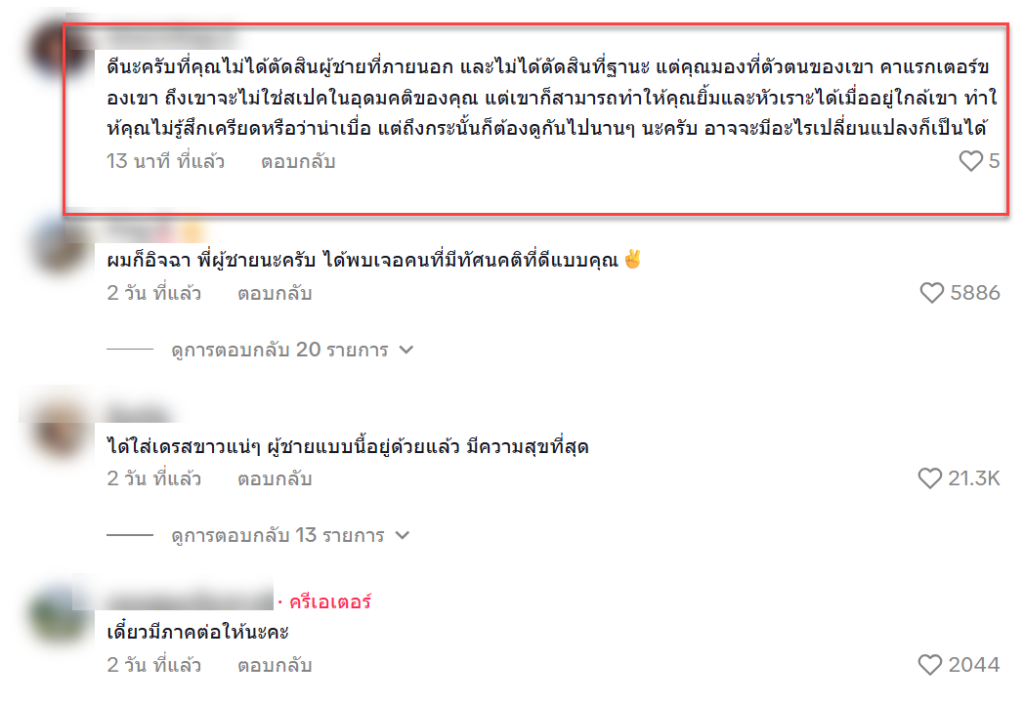 “ดีนะครับที่คุณไม่ได้ตัดสินผู้ชายที่ภายนอก และไม่ได้ตัดสินที่ฐานะ แต่คุณมองที่ตัวตนของเขา คาแรกเตอร์ของเขา ถึงเขาจะไม่ใช่สเปคในอุดมคติของคุณ แต่เขาก็สามารถทำให้คุณยิ้มและหัวเราะได้เมื่ออยู่ใกล้เขา ทำให้คุณไม่รู้สึกเครียดหรือว่าน่าเบื่อ แต่ถึงกระนั้นก็ต้องดูกันไปนานๆ นะครับ อาจจะมีอะไรเปลี่ยนแปลงก็เป็นได้”