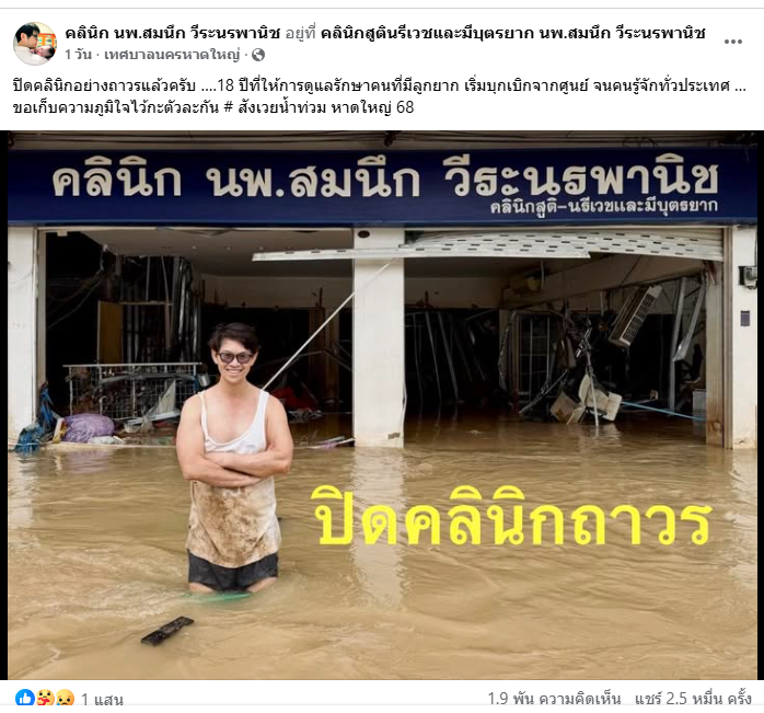 จากกรณีที่ทางเพจ นพ.สมนึก วีระนรพานิช ได้ออกมาโพสต์ประกาศปิดคลินิกถาวร หลังจากได้รับผลกระทบอย่างหนักจากสถานการณ์น้ำท่วมหาดใหญ่ โดยระบุว่า “ปิดคลินิกอย่างถาวรแล้วครับ 18 ปีที่ให้การดูแลรักษาคนที่มีลูกยาก เริ่มจากศูนย์จนคนรู้จักทั่วประเทศ ขอเก็บความภูมิใจไว้กับตัวแล้วกัน… สังเวยน้ำท่วมหาดใหญ่ 68”