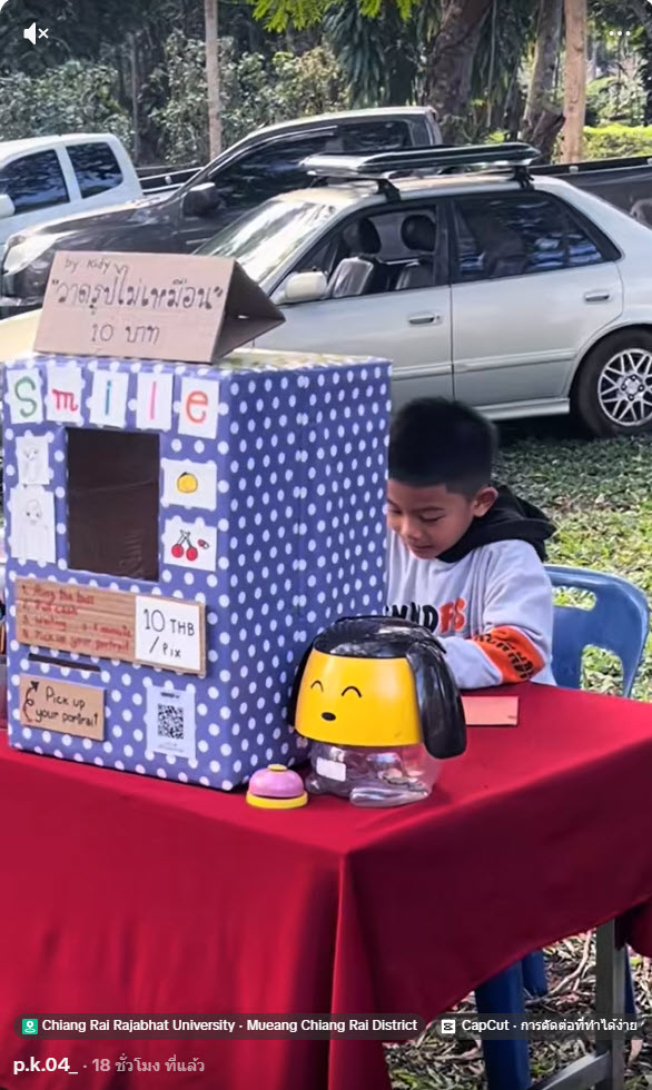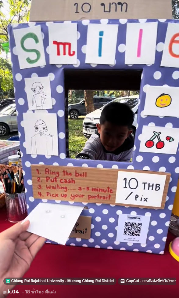 จุดเด่นของบูธคือการออกแบบแบบมีลูกเล่น ให้นั่งวาดผ่าน “ตู้” ที่ทำจากลังกระดาษ ดูคล้ายการถ่ายรูปในตู้สติกเกอร์ เพิ่มความสนุกและไอเดียสร้างสรรค์ ทำให้หลายคนที่เห็นต่างชื่นชมในความตั้งใจของน้อง