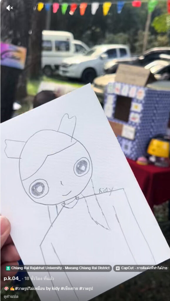 เห็นแล้วต้องบอกเลยว่าเป็นอีกหนึ่งกิจกรรมที่น่ารักมากๆ เมื่อบัญชีผู้ใช้ TikTok ที่ใช้ชื่อ @p.k.04_ ได้ออกมาโพสต์คลิปที่มีน้องคนหนึ่งมาตั้งบูธหารายได้ โดยการรับวาดภาพไม่เหมือนโดยจากในคลิปนั้นได้เผยให้เห็นว่า