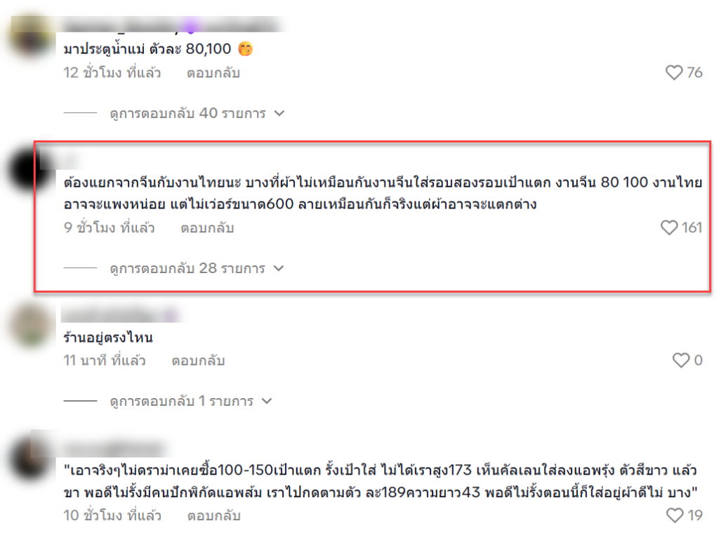 “ต้องแยกจากจีนกับงานไทยนะ บางที่ผ้าไม่เหมือนกันงานจีนใส่รอบสองรอบเป้าแตก งานจีน 80 100 งานไทยอาจจะแพงหน่อย แต่ไม่เว่อร์ขนาด600 ลายเหมือนกันก็จริงแต่ผ้าอาจจะแตกต่าง”