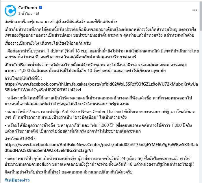 กำลังเป็นเรื่องที่วิพากษ์วิจารณ์กันอย่างหนักหลังจากที่ทางเพจ CatDumb ได้ออกมาโพสต์ถึงกรณีที่มีเพจ ที’ ลมฟ้าอากาศ ออกมาโพสต์เตือนถึง มหาอุทกภัย ก่อนหน้านี้ประมาณ 1 สัปดาห์ (วันที่ 18 พ.ย. ตอนนั้นน้ำยังไม่ท่วม แต่เริ่มมีฝนตกหนัก) แต่ทางเพจ Anti-Fake News Center Thailand ที่เป็นเพจของหน่วยงานรัฐ มาแปะป้ายว่าเป็น “ข่าวบิดเบือน” ไม่เป็นความจริงและตอนนี้กลับเกิดน้ำท่วมอย่างหนัก