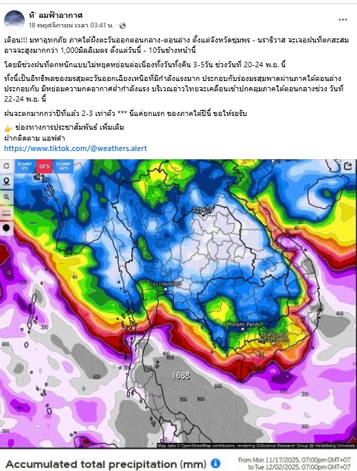 เกี่ยวกับปริมาณน้ำฝนว่าภาคใต้ของไทยตั้งแต่จังหวัดชุมพร ลงไปถึงนราธิวาส จะเจอฝนตกสะสม อาจจะสูงมากกว่า 1,000 มิลลิเมตร ตั้งแต่วันนี้ไปจนถึงอีก 10 วันข้างหน้า และอาจทำให้เกิดมหาอุทกภัย