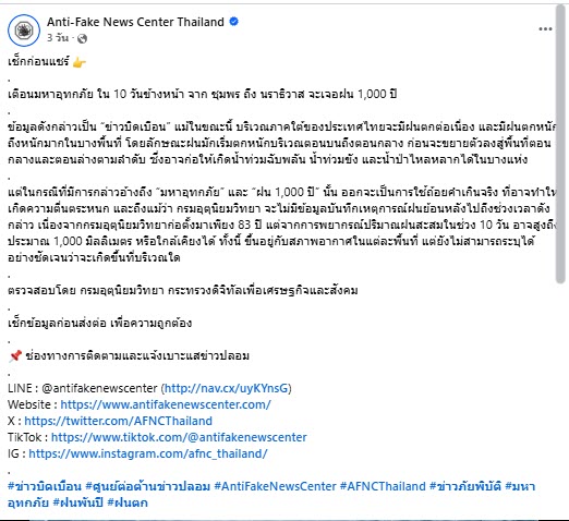 – พร้อมให้ข้อมูลว่าการอ้างถึง “มหาอุทกภัย” และ “ฝน 1,000 ปี” (ซึ่งตอนแรกเพจต้นทางใช้คำว่า 1,000 ปีจริง แล้วแก้ไขภายหลัง) เป็นการใช้ถ้อยคำที่เกินจริง อาจทำให้ประชาชนตื่นตระหนก