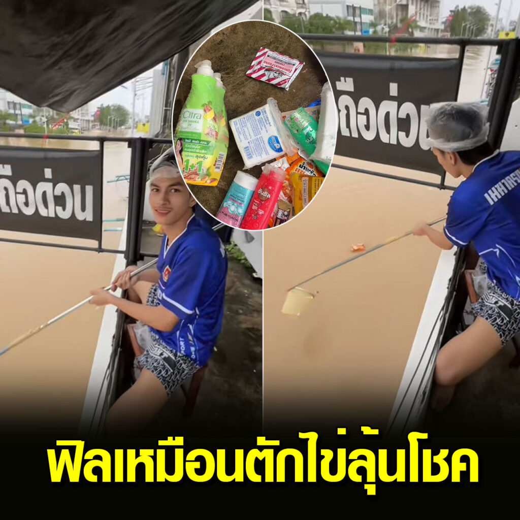 ผู้ประสบภัยทำไม้ตักอาหารที่ลอยมาตามน้ำ ไม่น่าเชื่อจะมีเยอะขนาดนี้