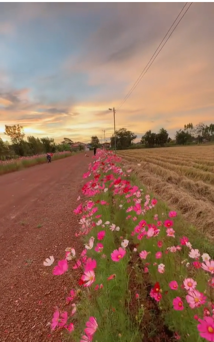 ริมข้างทางที่เต็มไปด้วยดอกไม้ ซึ่งเป็นถนนลูกรัง และทุ่งนา กับบรรยากาศในช่วงพระอาทิตย์กำลังจะตกดิน
