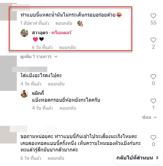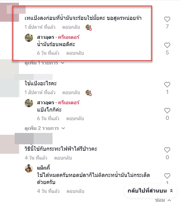 จากคลิปนี้ก็มีหลายคนเข้ามาแสดงความคิดเห็นกันอย่างมากมาย”เทแป้งลงก่อนที่น้ำมันจะร้อนใช่มั้ยคะ ขอสูตรหน่อยจ้า”