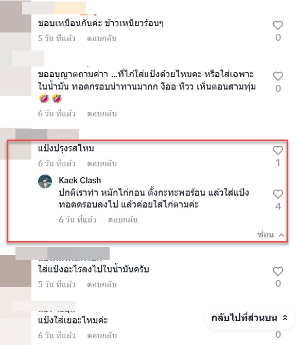 ทั้งนี้มีหลายคนเข้ามาบอกว่า เป็นวิธีทอดไก่ที่เพิ่งรู้ว่าทำแบบนี้ได้ ไม่ต้องคลุกแป้งก่อน แบบนี้ไม่ติดกระทะด้วย
