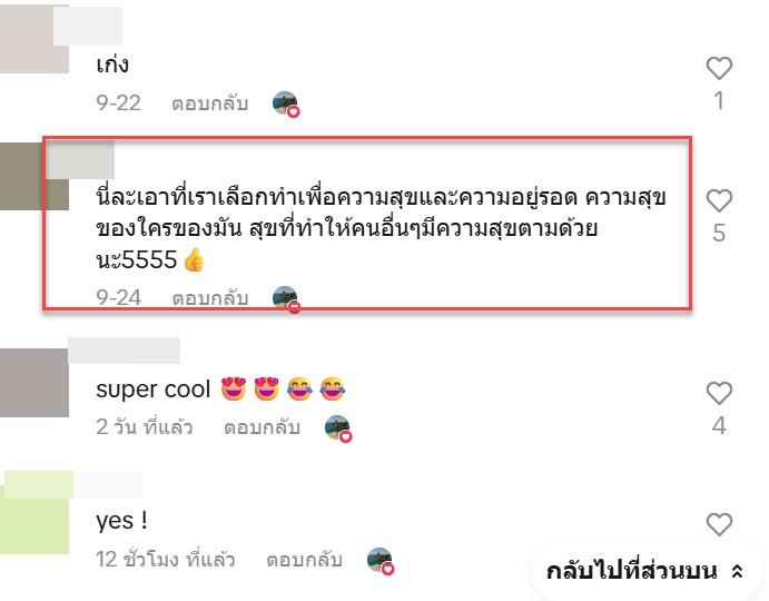 “นี่ละเอาที่เราเลือกทำเพื่อความสุขและความอยู่รอด ความสุขของใครของมัน สุขที่ทำให้คนอื่นๆมีความสุขตามด้วยนะ5555”
