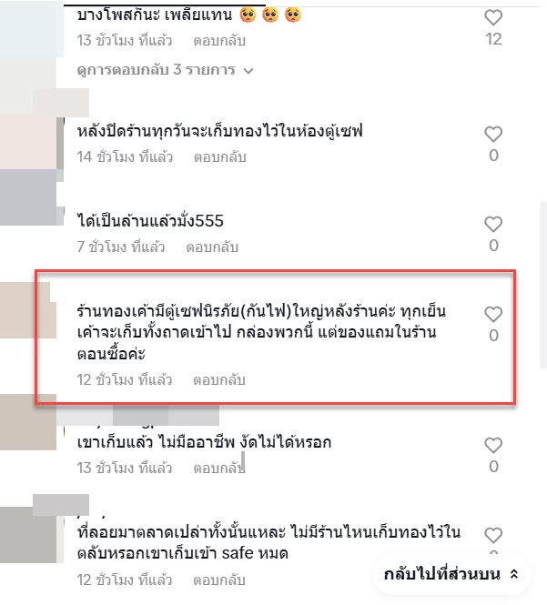 “ร้านทองเค้ามีตู้เซฟนิรภัย(กันไฟ)ใหญ่หลังร้านค่ะ ทุกเย็นเค้าจะเก็บทั้งถาดเข้าไป กล่องพวกนี้ แต่ของแถมในร้านตอนซื้อค่ะ”