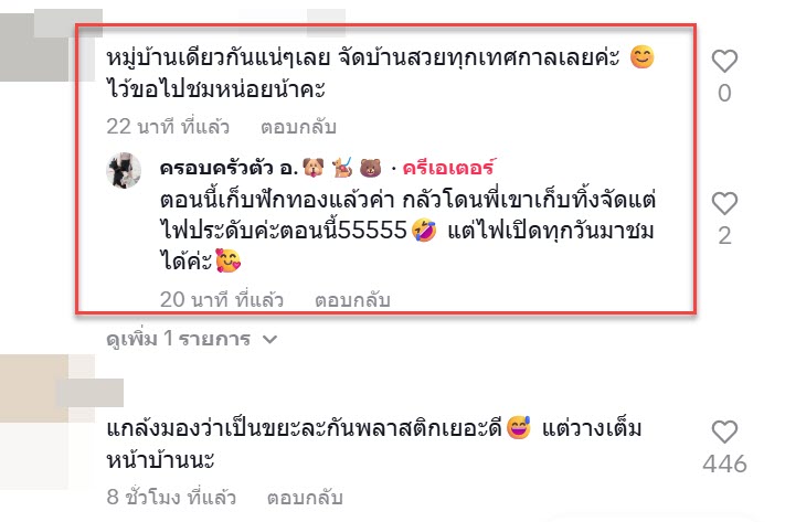 ต้องอธิบายก่อนว่าปกติหมู่บ้านเราจัดทุกปีอยู่แล้ว ปีนี้นิติมีประกาศแล้วด้วยว่ามีการจัดกิจกรรมเราเลยแต่งบ้านไว้ ปีก่อนๆไม่เคยมีเหตุการณ์แบบนี้ พี่คนเก็บขยะอาจจะไม่รู้หรือเพิ่งมาทำ เราไม่ได้โทษพี่เขาอะไรเลย ยังดีที่เราออกไปบอกทันก่อนที่เขาจะโยนขึ้นรถเก็บขยะ และเราได้บอกนิติให้ชี้แจงกับพนักงานเก็บขยะเรียบร้อยแล้วค่ะ
