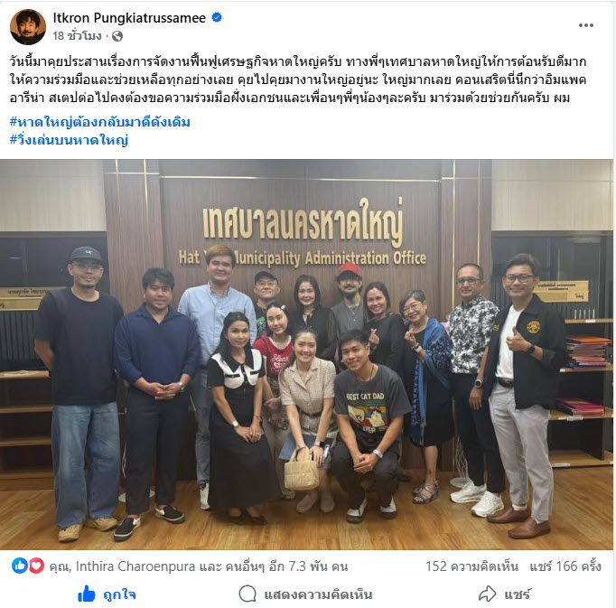 “วันนี้มาคุยประสานเรื่องการจัดงานฟื้นฟูเศรษฐกิจหาดใหญ่ครับ ทางพี่ๆเทศบาลหาดใหญ่ให้การต้อนรับดีมาก ให้ความร่วมมือและช่วยเหลือทุกอย่างเลย คุยไปคุยมางานใหญ่อยู่นะ ใหญ่มากเลย คอนเสริตนี่นึกว่าอิมแพคอารีน่า สเตปต่อไปคงต้องขอความร่วมมือฝั่งเอกชนและเพื่อนๆพี่ๆน้องๆละครับ มาร่วมด้วยช่วยกันครับ ผม #หาดใหญ่ต้องกลับมาดีดังเดิม #วิ่งเล่นบนหาดใหญ่”