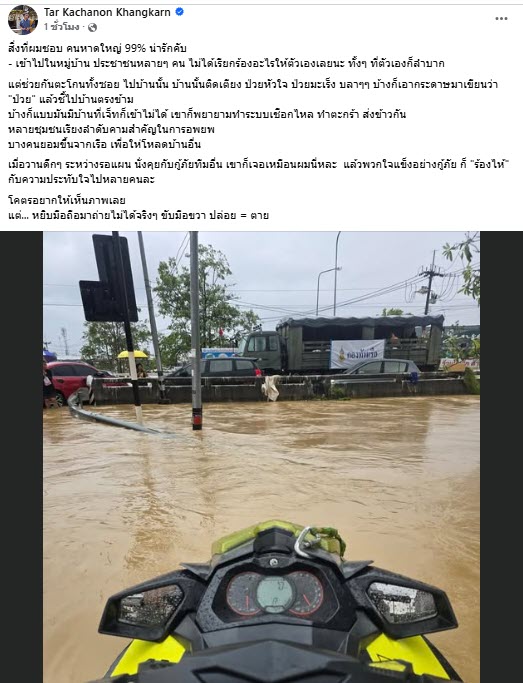 หลังจากมีดราม่าออกมาอย่างต่อเนื่องสำหรับทีมงานกู้ภัยที่เข้าไปช่วยเหลือผู้ประสบภัย แต่ด้วยอุปสรรค์ที่มีเยอะทำให้อาจจะทำให้เกิดความล่าช้าและไม่ทั่วถึง โดยล่าสุดบัญชีผู้ใช้เฟซบุ๊กที่ใช้ชื่อ Tar Kachanon Khangkarn ซึ่งเป็นทีมงานกู้ภัยได้ออกมาโพสต์ว่า