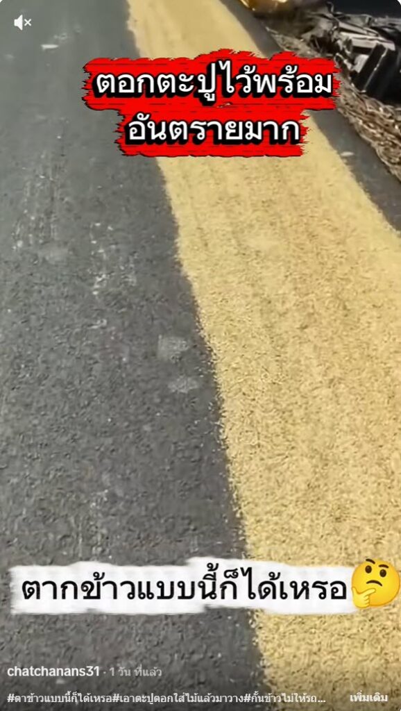 จากคลิปนี้ก็ถือว่าเป็นอีกหนึ่งรูปแบบหนึ่งของคนที่มาตากข้าวบนถนน ยังไงก็อยากให้ระวัง และฝากถึงชาวนาเองก็ให้หาพื้นที่ในการตากข้าวไม่ใช่บนท้องถนน
