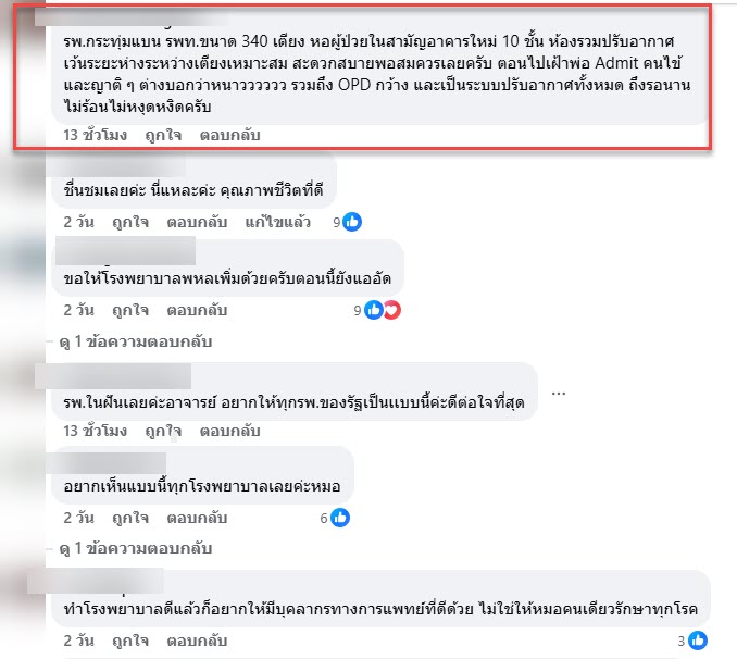 ทั้งนี้ก็ได้มีหลายคนเข้ามาแสดงความคิดเห็นกันอย่างมากมาย ทั้งยังเข้ามาชื่นชมทางโรงพยาบาล และอยากให้โรงพยาบาลนี้เป็นแบบอย่างของโรงพยาบาลอื่นๆด้วย