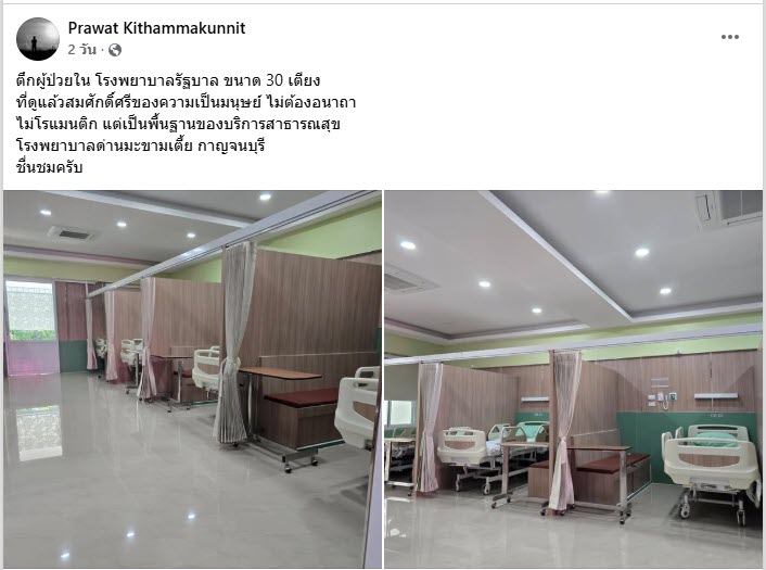 ถือเป็นอีกหนึ่งโพสต์ที่ได้รับการแชร์อย่างมากมายหลังจากที่ผู้ใช้ TikTok ที่ใช้ชื่อ Prawat Kithammakunnit ได้ออกมาโพสต์ภาพพร้อมระบุว่า “ตึกผู้ป่วยใน โรงพยาบาลรัฐบาล ขนาด 30 เตียง ที่ดูแล้วสมศักดิ์ศรีของความเป็นมนุษย์ ไม่ต้องอนาถา ไม่โรแมนติก แต่เป็นพื้นฐานของบริการสาธารณสุข โรงพยาบาลด่านมะขามเตี้ย กาญจนบุรี ชื่นชมครับ”