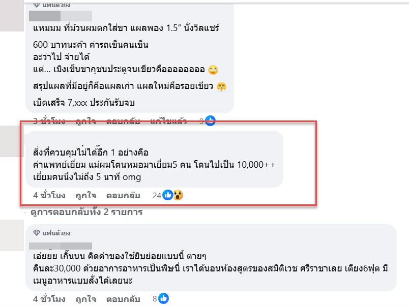 จากโพสต์นี้มีหลายท่านเข้ามาแสดงความคิดเห็นกันอย่างมากมายทั้งบอกว่า “สิ่งที่ควบคุมไม่ได้อีก 1 อย่างคือ ค่าแพทย์เยี่ยม แม่ผมโดนหมอมาเยี่ยม5 คน โดนไปเป็น 10,000++ เยี่ยมคนนึงไม่ถึง 5 นาที omg”