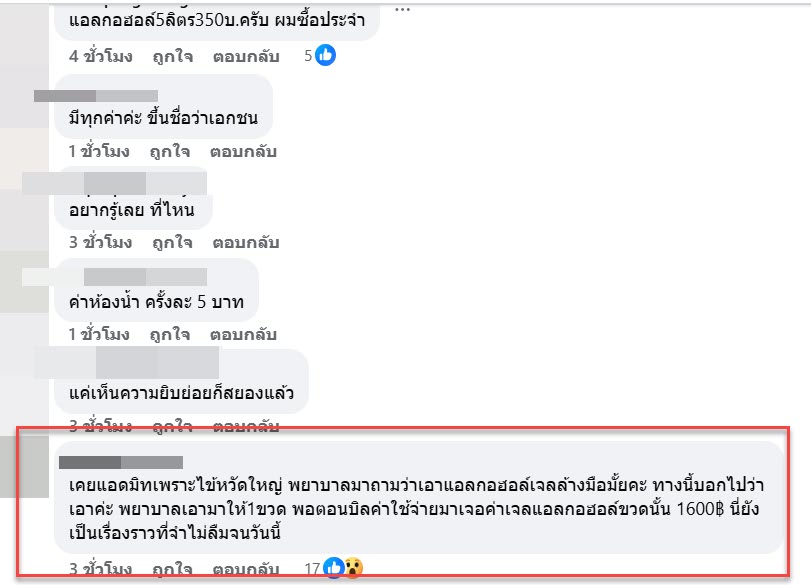 “เคยแอดมิทเพราะไข้หวัดใหญ่ พยาบาลมาถามว่าเอาแอลกอฮอล์เจลล้างมือมั้ยคะ ทางนี้บอกไปว่าเอาค่ะ พยาบาลเอามาให้1ขวด พอตอนบิลค่าใช้จ่ายมาเจอค่าเจลแอลกอฮอล์ขวดนั้น 1600฿ นี่ยังเป็นเรื่องราวที่จำไม่ลืมจนวันนี้”