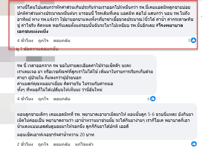 “ทางนี้โดนไปแสนกว่าหักค่าส่วนเกินประกันจ่ายเราออกไป6หมื่นกว่า รพ.นี้เคยแอดมิทลูกชายบ่อยปกติค่าส่วนต่างประมาณหมื่นต้นๆ มารอบนี้ โรคเดิมที่เคย แอดมิท ล่อไป แสนกว่า นอน รพ.ไม่ถึง อาทิตย์ ทาง รพ.แจ้งว่า ใช้ยานอกยาแพงทั้งๆที่ยาฆ่าเชื้อขวดประมาณ3นิ้วได้ ค่าน้ำ ค่ากระดาษทิชชู่ ค่าไซริง คิดหมด พอกันเลยตั้งแต่รอบนั้นฉันจะไมาไปเหยียบ รพ.นั้นอีกเลย โรงพยาบาลเอกชนแห่งหนึ่ง”