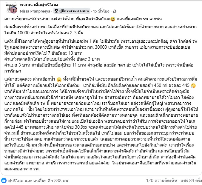 เป็นอีกหนึ่งประเด็นที่ได้รับความสนใจอย่างมากในโลกออนไลน์ หลังจากที่ผู้ใช้เฟซบุ๊กรายหนึ่งได้ออกมาโพสต์เล่าประสบการณ์ หลังจากที่พาผู้สูงอายุในบ้านไปนอนโรงพยาบาล 1 คืน แบบไม่มีประกัน แต่สิ่งที่เจอคือค่าใช้จ่ายแบบจุกจิก