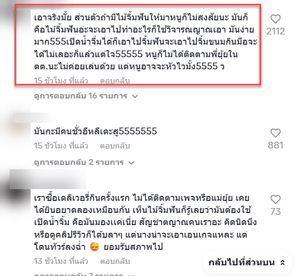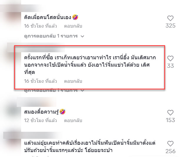 “ครั้งแรกที่ซื้อ เราเก็ทเลยว่าเอามาทำไร เรานี่อึ้ง มันเลิศมาก นอกจากจะใช้เปิดน้ำจิ้มแล้ว ยังเอาไว้จิ้มแข่วได้ด้วย เลิศที่สุด”